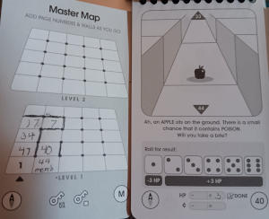 Yesterday, I got a bundle of little notebook games I'd ordered in the mail, called PaperApps. They seem very cute, and I started in on them with one called Labyrinth, which is kind of an elaborate choose-your-own-adventure styled like a first person dungeon crawler. I really enjoy this so far! The art and flavor text is fun, and I'm loving mapping out the rooms I've visited, which is to the left in my "screenshot." It'll be hard not to buzz through this very quickly.
